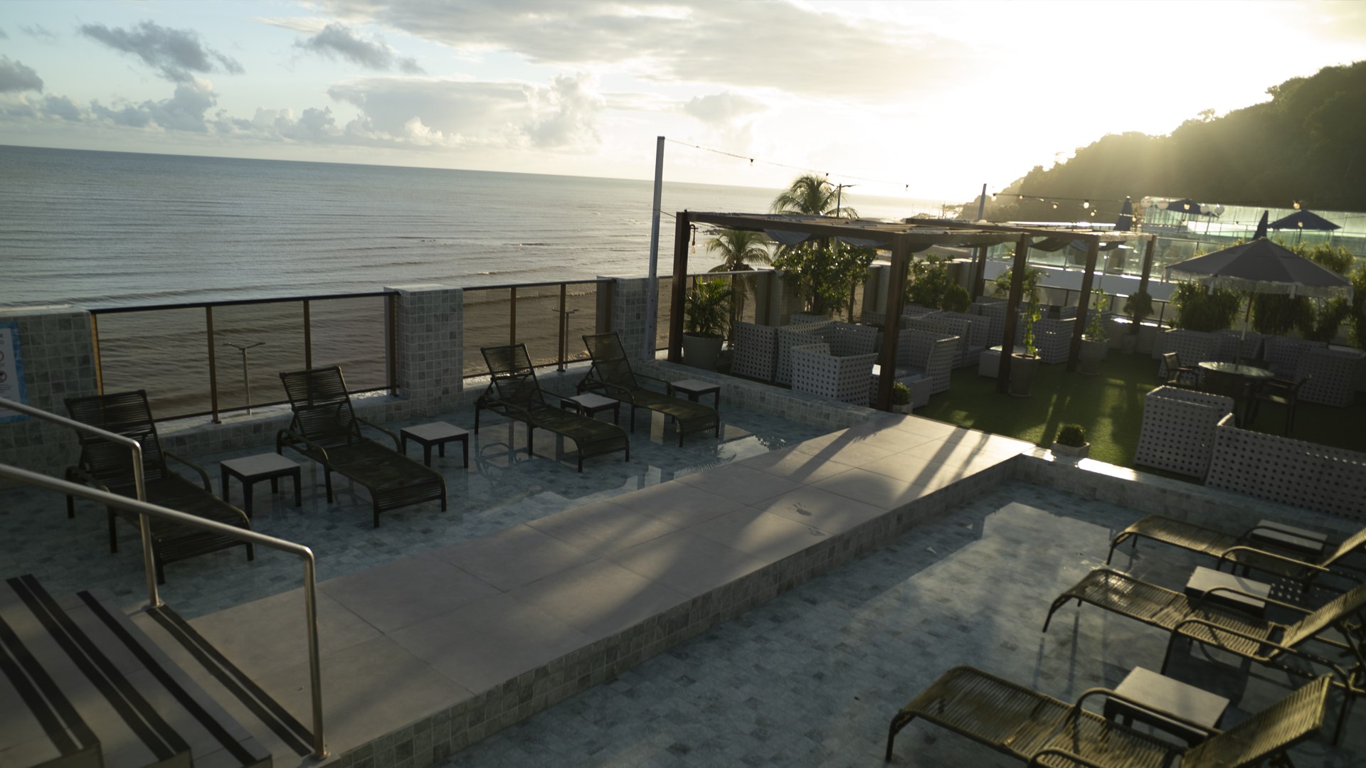 Vista aérea da área da piscina na cobertura, com espreguiçadeiras, guarda-sóis e mesas de jantar sobre grama artificial.